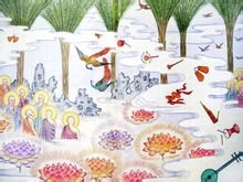 各色灵鸟飞翔,昼夜六时,出和雅音,演畅妙法。众多妙华飘散,昼夜六时,雨天曼陀罗华,赏心悦目,开神启悟,西方净土可谓是花卉博览园。