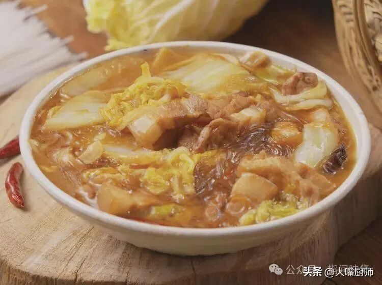 准备猪肉、粉条、白菜、生抽、老抽、大葱、生姜、八角、干辣椒、蒜瓣、食盐、食用油。 1、大白菜洗干净,帮子切成大块,叶子用手撕成大片。五花肉洗干净,切成薄片,大葱切段,生姜切片,蒜瓣拍碎。起锅烧油,放入五花肉小火煸炒,炒出肉中的油脂。 2、肉片颜色焦黄后放入葱姜蒜、八角、干辣椒,大火翻炒出香味,倒入白菜帮子翻炒一会儿,断生后放入料酒、生抽、老抽翻炒均匀。 3、倒入开水,放入提前泡好的粉条和白菜叶,盖上盖子小火炖15分钟,加入适量盐调味,大火把汤汁收浓,即可出锅。