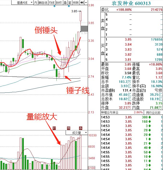 众所周知,市场资金的操作风格有很多种,短线差价,中线波段,长线价值,还有的多重风格随意切换。套利君都会一些,今天主要给大家讲讲短线常用的三种买入绝技,大家学会之后,可以增加自己的武器库,在下一波牛市来临之际,能用多重策略捕捉到下一只妖股。 值得注意的是,这几种买入信号,在大盘成交量较为活跃的阶段比较适用,大盘处于顶部区域时,系统性风险并未解除,效率会大幅降低。 第一种 短线买入信号:倒锤子线 倒锤子线实体很短,上影线长度超过了实体长度的两倍,几乎没有下影线。这种形态出现在一段下跌行情之后,是看涨的信号,买点——股价突破了倒锤子线上的影线的最高点时买入。 技术要点 1、倒锤子线的上影线越长,说明多方在推动股价上涨的能量就越强,该形态的看涨信号也就越强烈。 2、在倒锤子形成的同时如果成交量放大,则该形态看涨信号会更加强烈。 3、投资者可以将倒锤子线出现当日最低价设置和止损点,买入的时配合KDJ或者捕捞季节的资金大量进入。 实战案例:农发种业 农发种业在5月7日形成一个倒锤头形态后,量能放出近期的天量水平,叠加“”大豆涨价预期,该股随后连续走出上升通道。