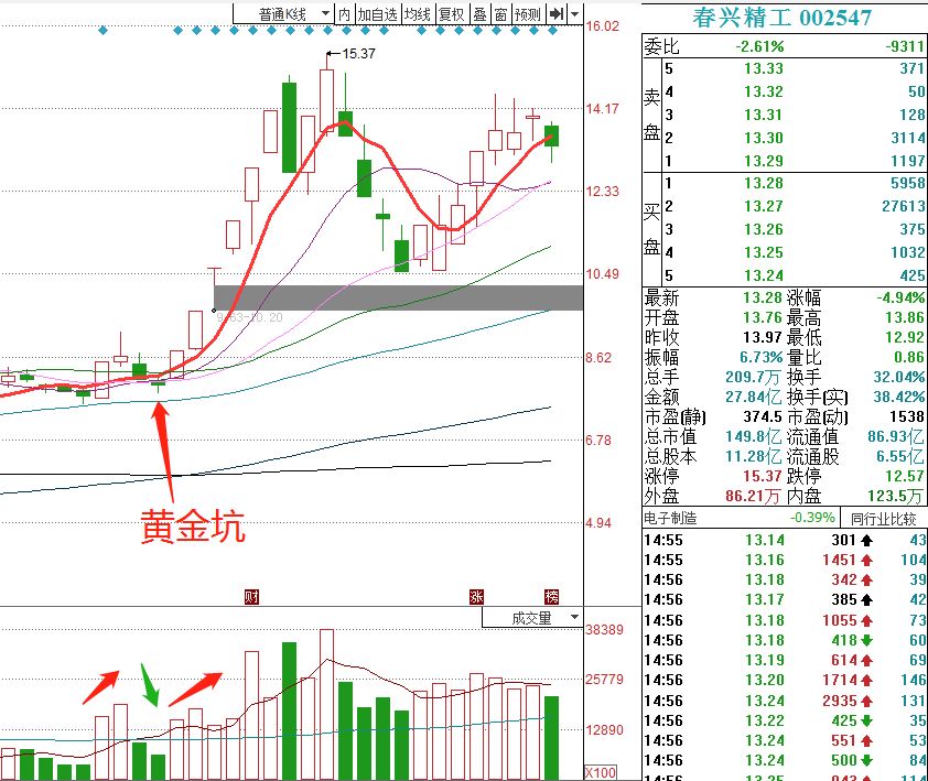 第二种短线买入信号:黄金坑 黄金坑是指大阳开出后的几个交易日出现了缩理的回调,并且回调的低点没有击穿前面阳线的开盘价,此时黄金坑形成,随后股价又出大阳创出了近几天的新高。 技术要点 1、第一个大阳线实体越大越好,超过7%,甚至是涨停板最好; 2、大阳线的量比达到1.5倍以上,量能均线向上发生金叉; 3、回调的低点不能击穿前期阳线的开盘价。 实战案例:春兴精工 春兴精工在4月9日收出一根阳线涨停,量比放大倍数远不止1.5倍,随后3天缩量回踩,第4天继续上攻,市场资金挖掘它的5G概念后得到疯炒,连续走出5个涨停,阶段涨幅高达50%以上。发现有黄金坑走势的票,一旦启动果断买入,大概率会有高额收益。