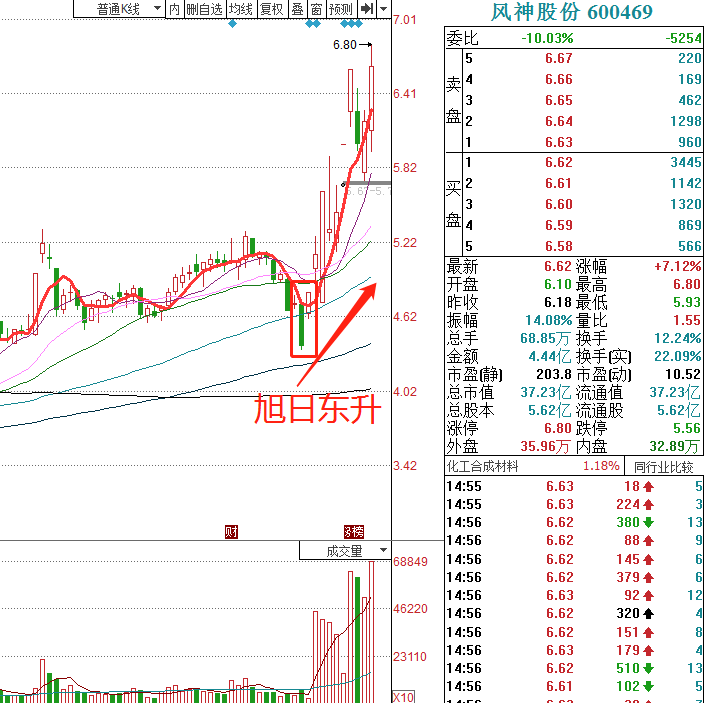第三种短线买入信号:旭日东升 当股价形成下跌趋势出现连连暴跌时,通常会低开低走,甚至连续收阴,而随着空方力量的逐渐耗尽,多方在次日立即还以颜色,令该股的股价突然大幅跳空高开,延续上升至终盘,令股价收出近乎光头光脚的长阳线,并一举将上一交易日的阴线覆盖,这种 k 线组合形态就叫做“旭日东升”。 技术要点 1、出现在下跌趋势中。 2、由一阴一阳两根 k 线组成。 3、阳线收盘价高于阴线开盘价,阳线实体高出阴线实体部分越多,转势信号越强。 实战案例:风神股份 如图, 风神股份在4月30日突然高开低走收阳线,一举扭转前期的下跌趋势,随后一波短线拉升,最高涨幅超过50%以上。  上面提到的三种买入信号,都需要结合量能的持续放大来观察主力动向,一般位置不宜太高,结合低位的形态突破使用成功率会更高。 |